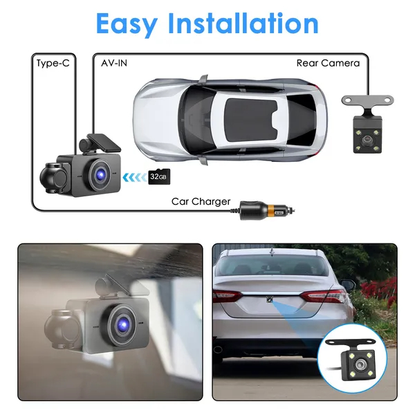 Equipped with a 1080P Full HD front camera(140° wide view),480P interior camera(110° coverage),and 480P rear camera(110° monitoring range),this 3-channel dash camera ensures complete 360° protection for your vehicle. The front lens captures crisp details of license plates and road signs,while the rear camera provides real-time traffic awareness. Unique picture-in-picture display helps capture and retain evidence inside and in front of the car in unexpected collision.